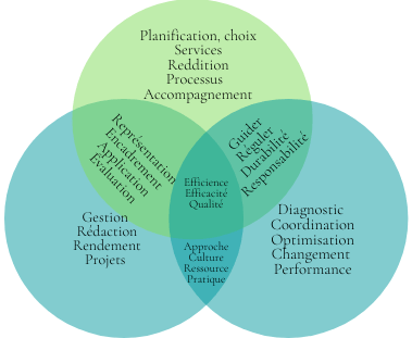 L’entrecroisement de chacun des cercles démontre cette interrelation essentielle entre la gouvernance, l’administration quotidienne et le management et le cercle tout autour représente cette organisation unie pour offrir un service, dans une mission et une vision qui sont communes.